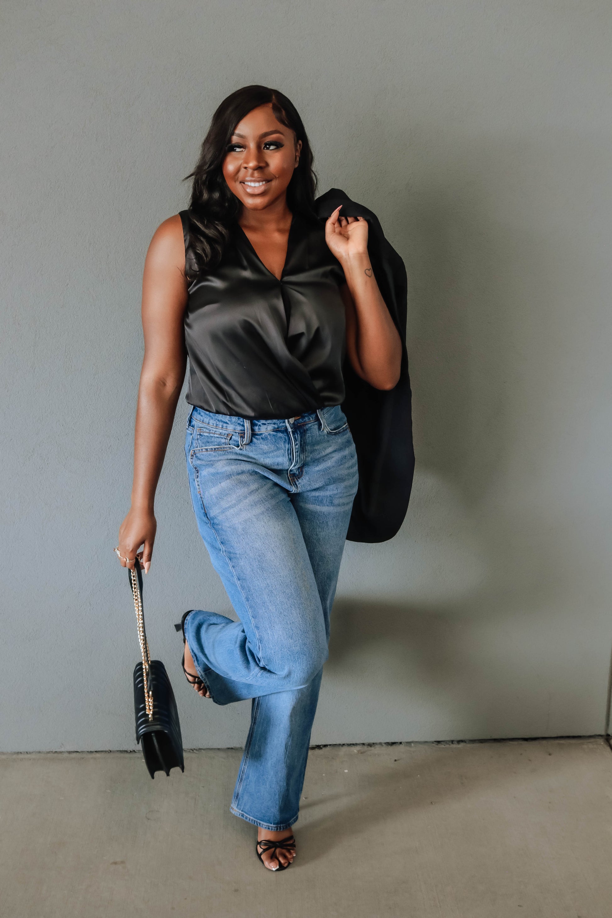 Sleek and sophisticated, the Allure Satin Bodysuit features a flattering surplice neckline and convenient snap button closure. Perfect for a night out or a chic layered look, this black satin bodysuit is a versatile addition to any wardrobe.