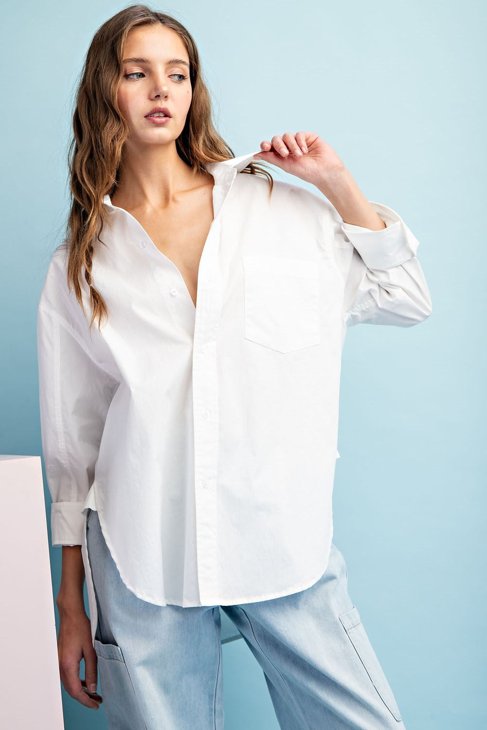 Our Fave Essential Button Down is an essential addition to any wardrobe. This versatile button down can be dressed up or down for any occasion, making it a must-have piece. It's a classic and timeless choice that you won't want to live without! This beauty is oversized and features a collared neckline, chest pocket and buttoned cuff. Snag yours now!
