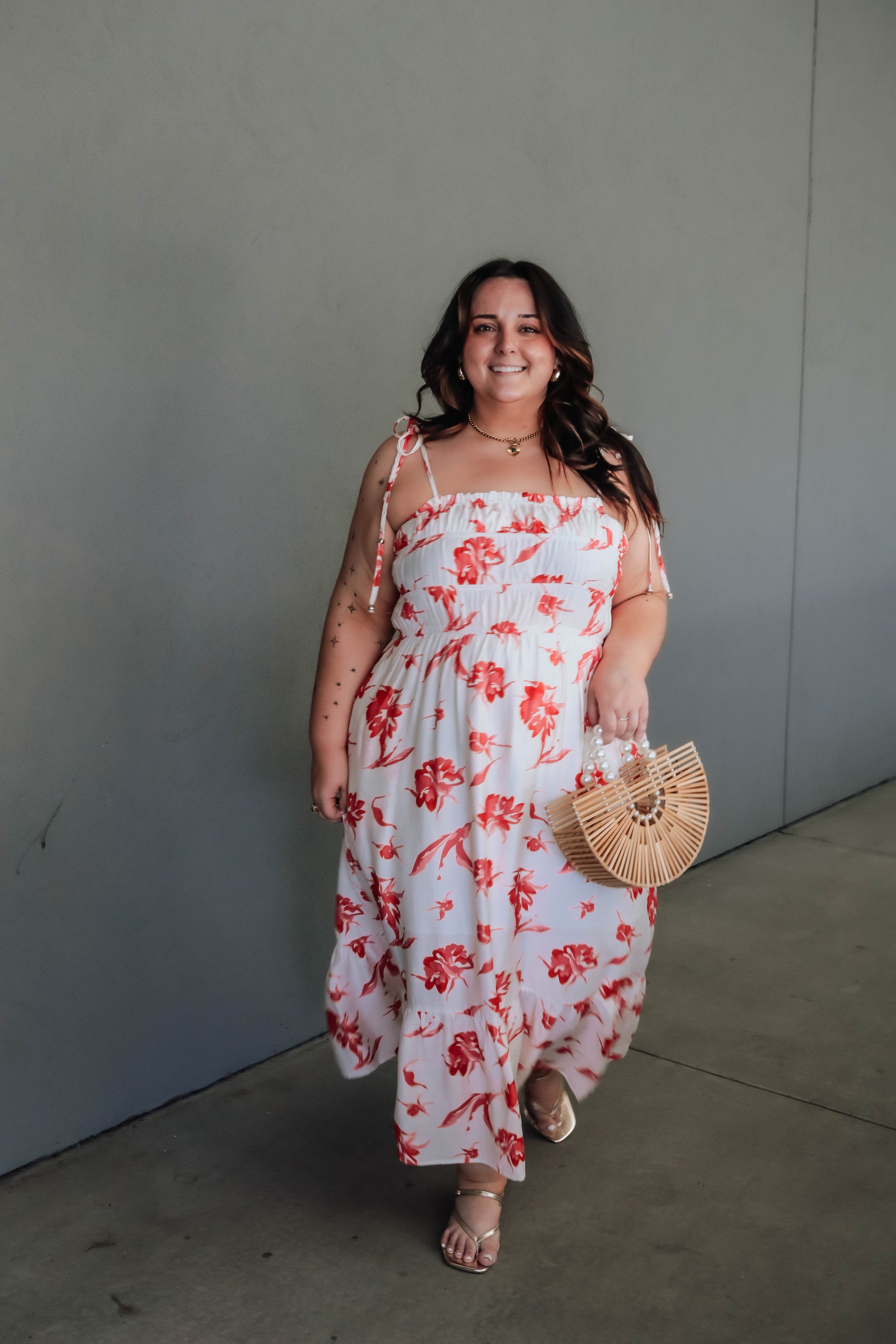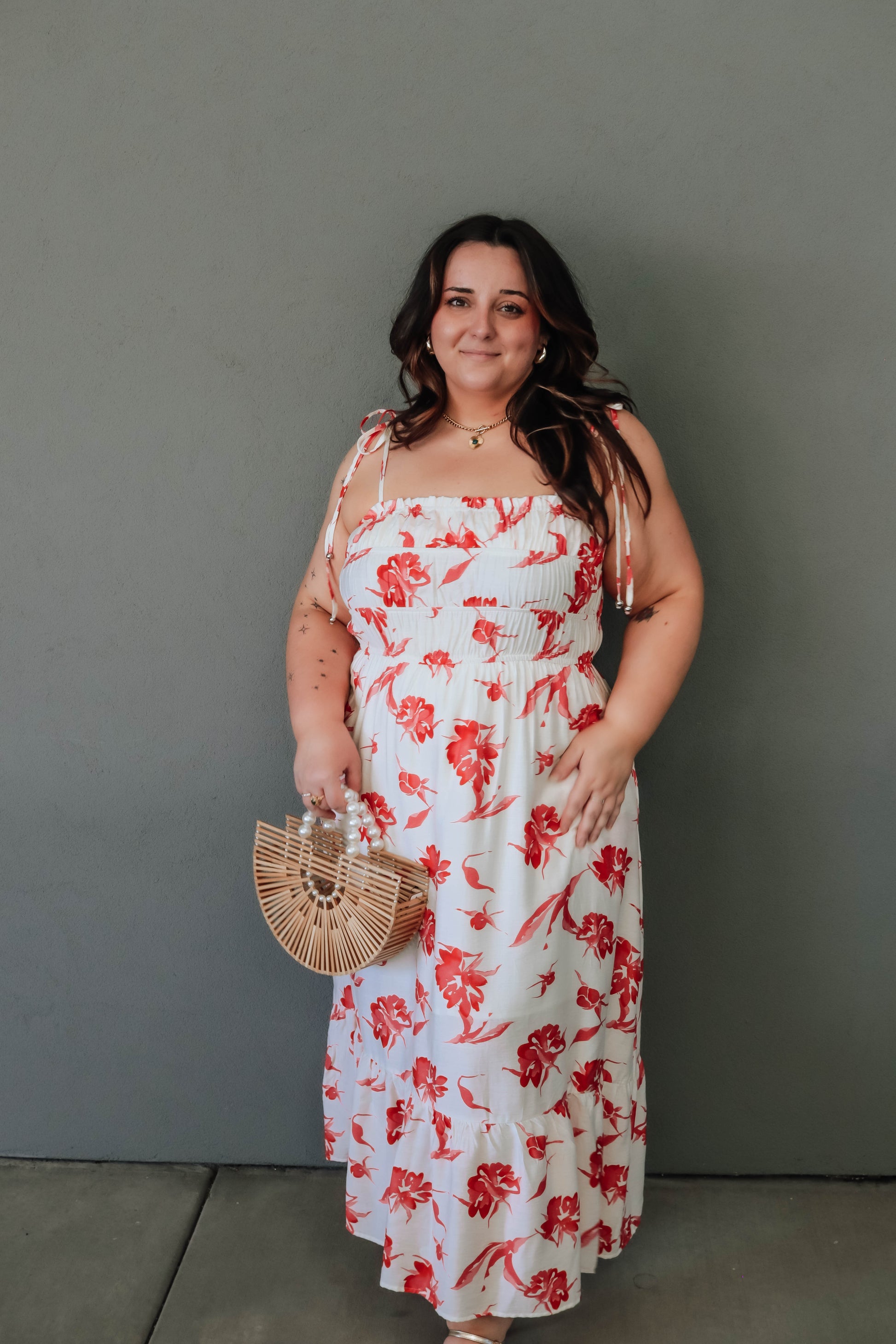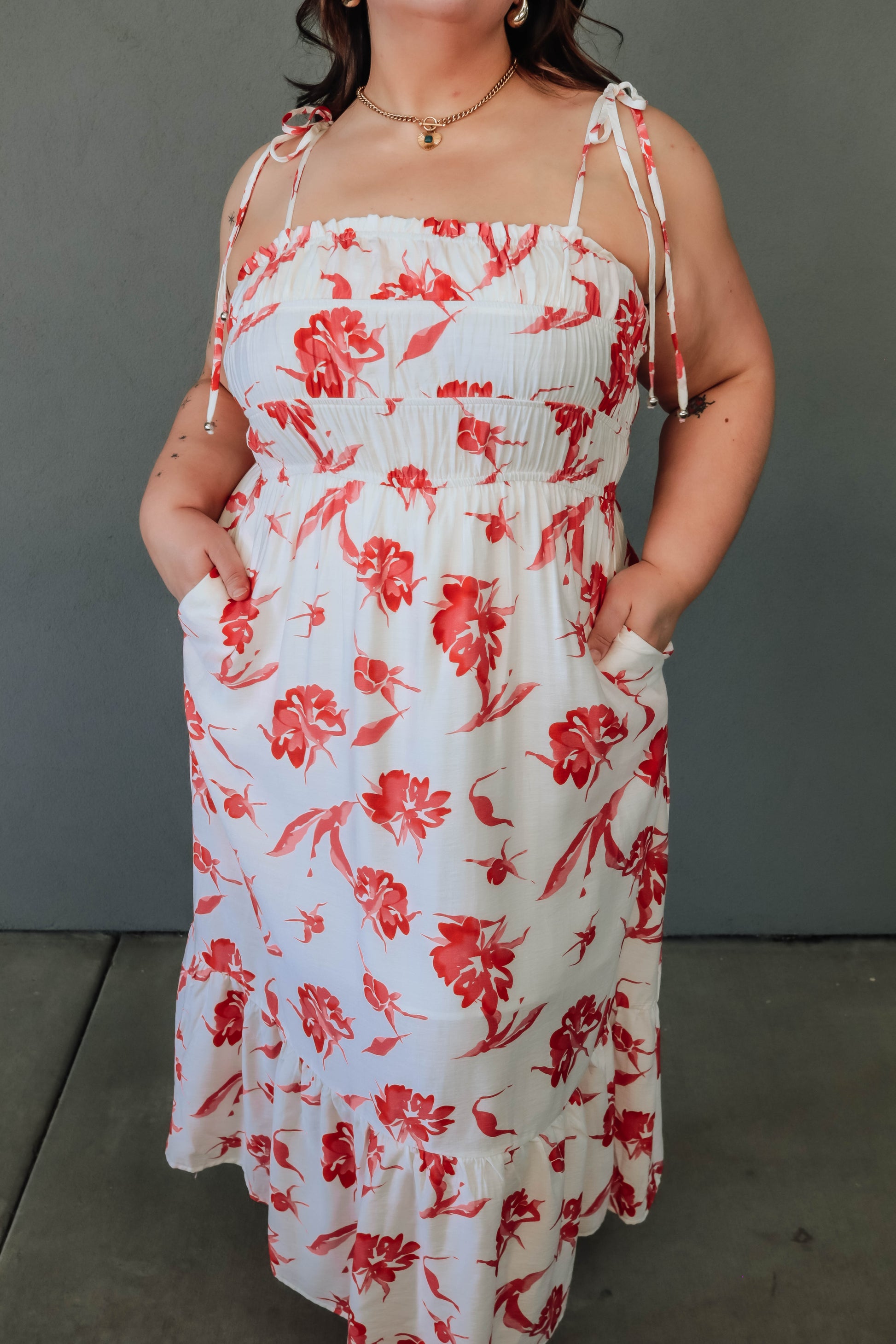 This playful floral maxi dress features shoulder ties and a ruched top for a flirty touch. It’s a lightweight, woven design with side pockets and a comfortable lining, perfect for breezy days without any sheerness.
