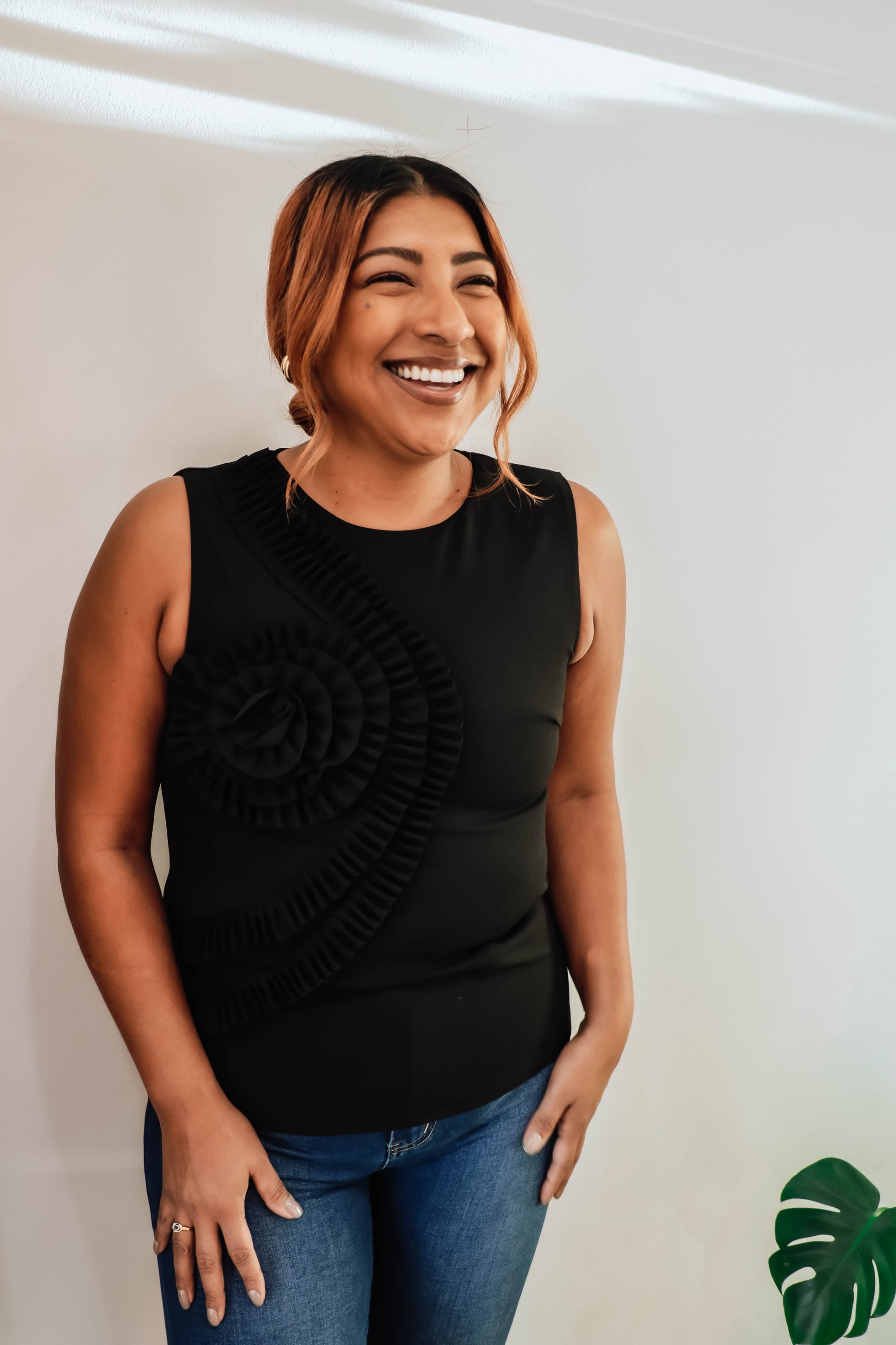 The black flower design makes it versatile enough to pair with your favorite jeans or a sleek skirt. Elevate your style with this must-have piece!