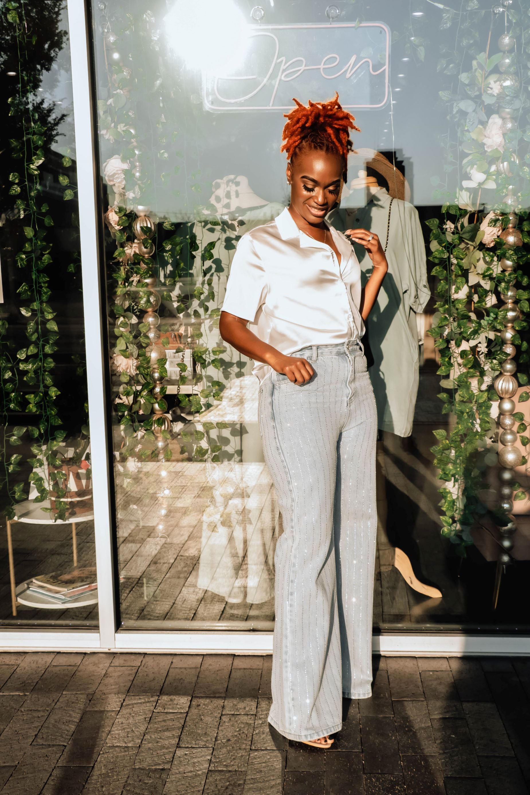 Make a statement in our "I've Arrived Rhinestone Denim" These beauties are EVERYTHING. They feature a regular rise, functional pockets, straight legs, a beautiful rhinestone design and they are a quality denim. The do run snug with no stretch so we advise you to size up. Be warned, these pants are a real showstopper!