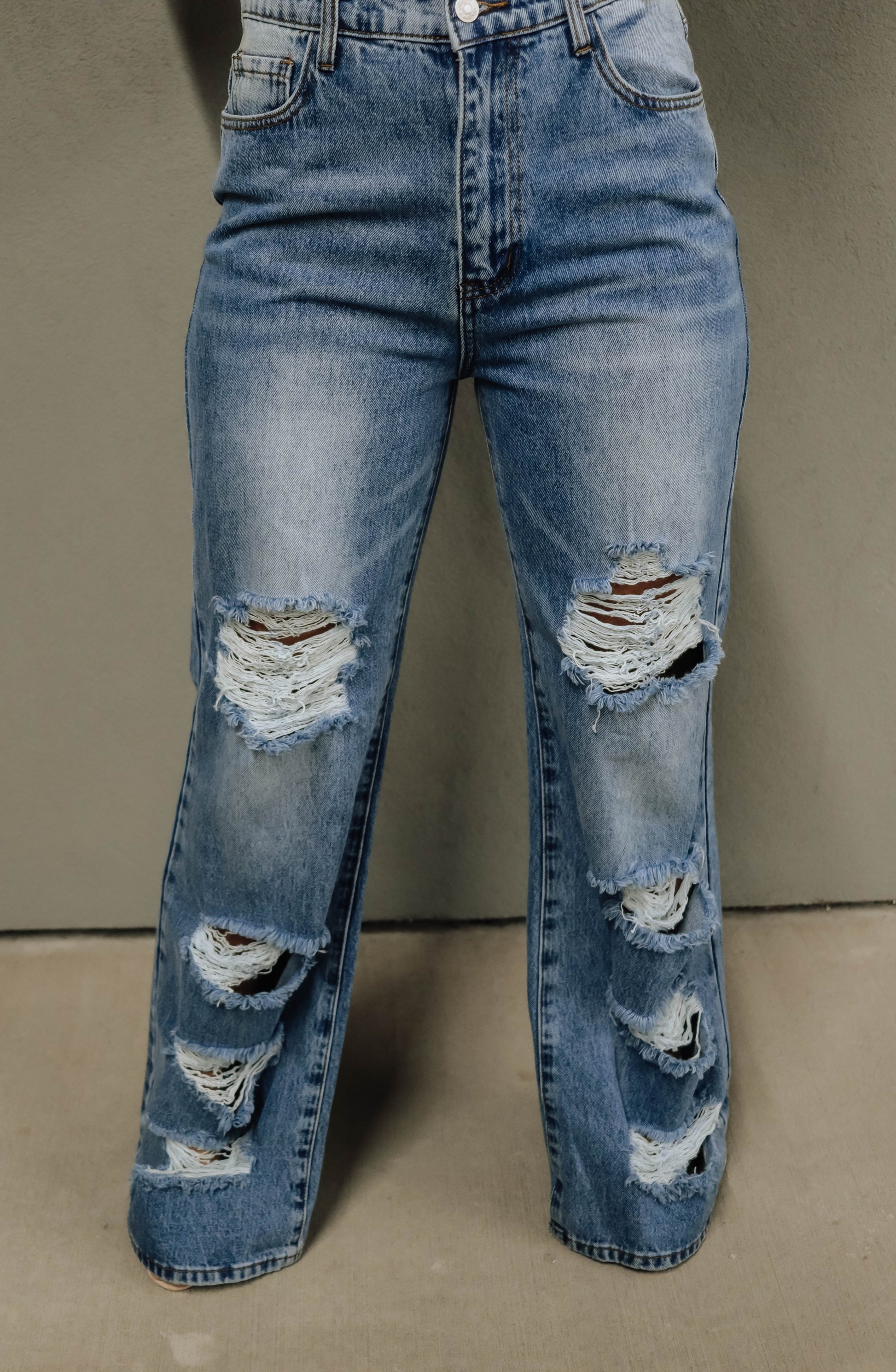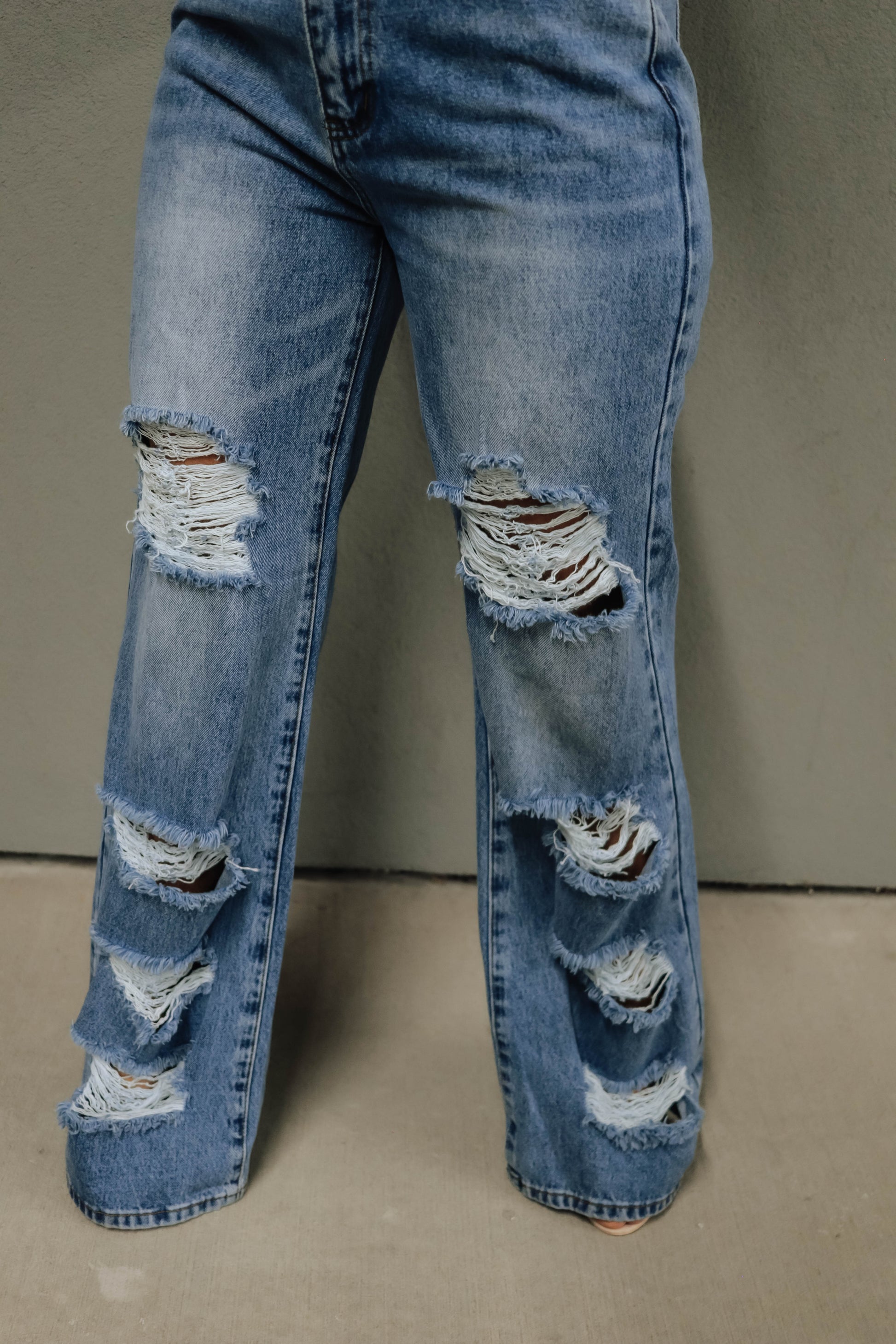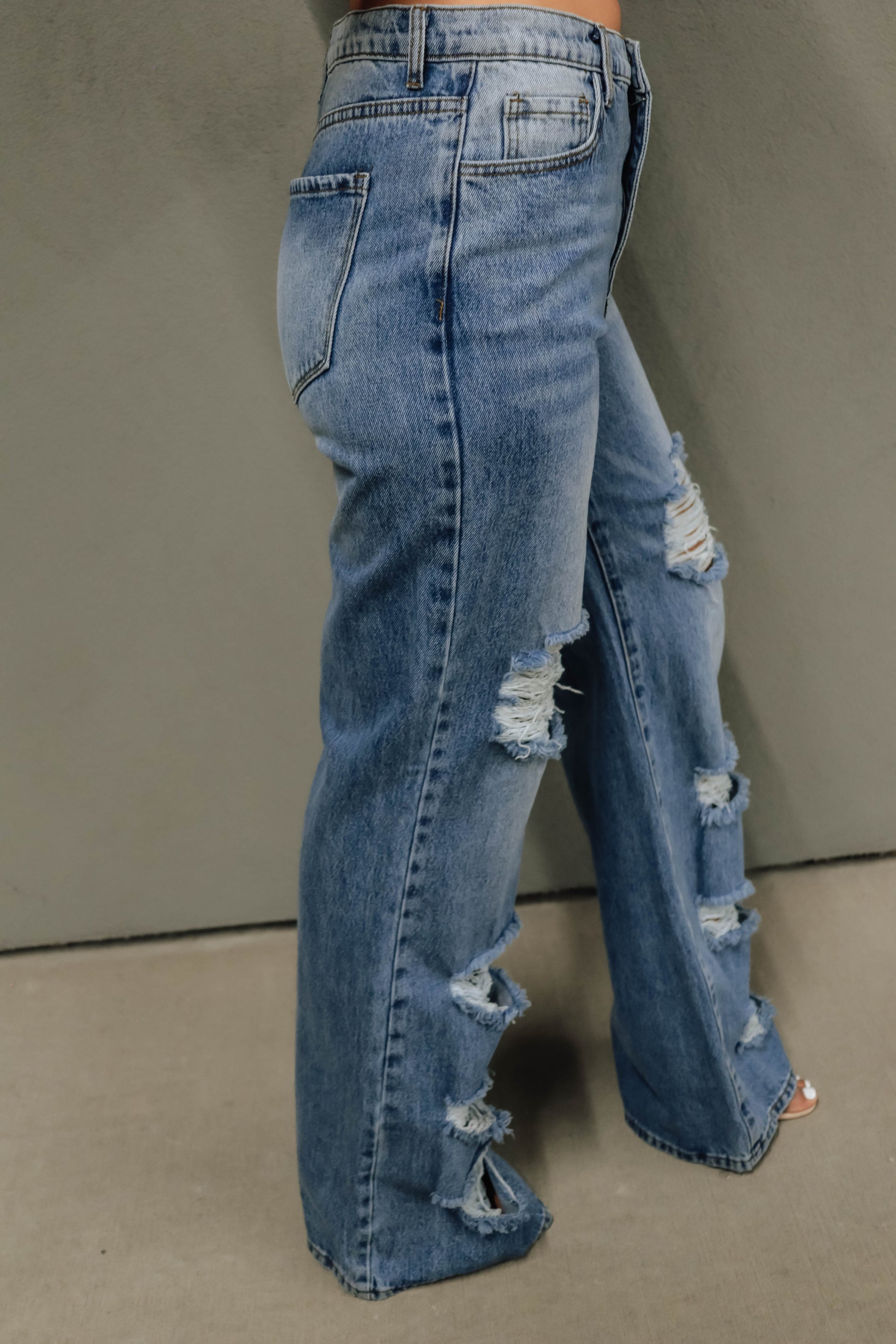 Elevate your denim game with our High-Rise Distressed Wide Leg Jeans in Medium Stone. These jeans are the perfect blend of style and comfort, featuring trendy distressing and a classic 5-pocket construction. The 33" inseam offers a flattering silhouette that pairs well with any top, whether you dress them up with heels or keep it casual with sneakers. Ready to make a statement? Then these jeans are a must-have in your wardrobe.