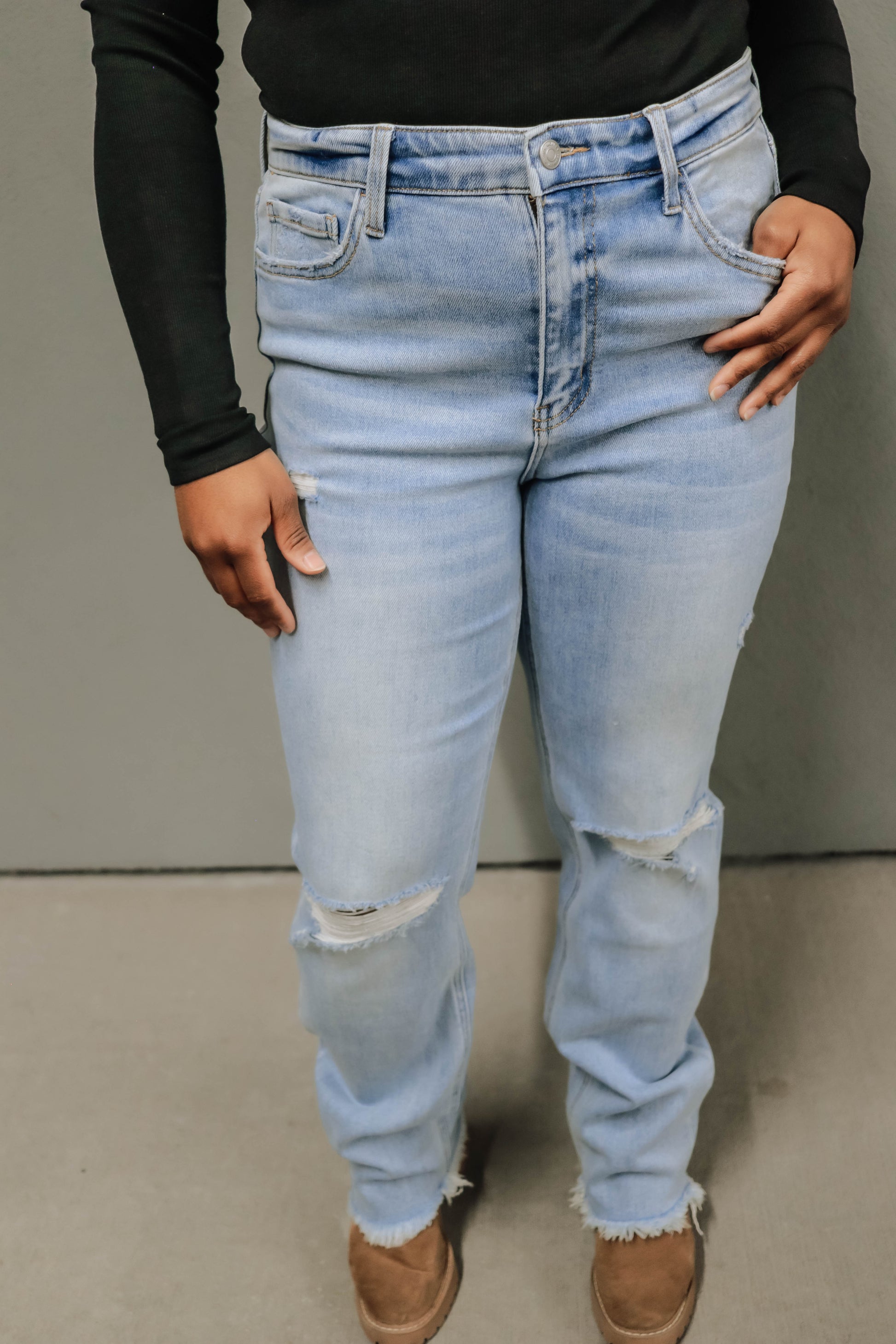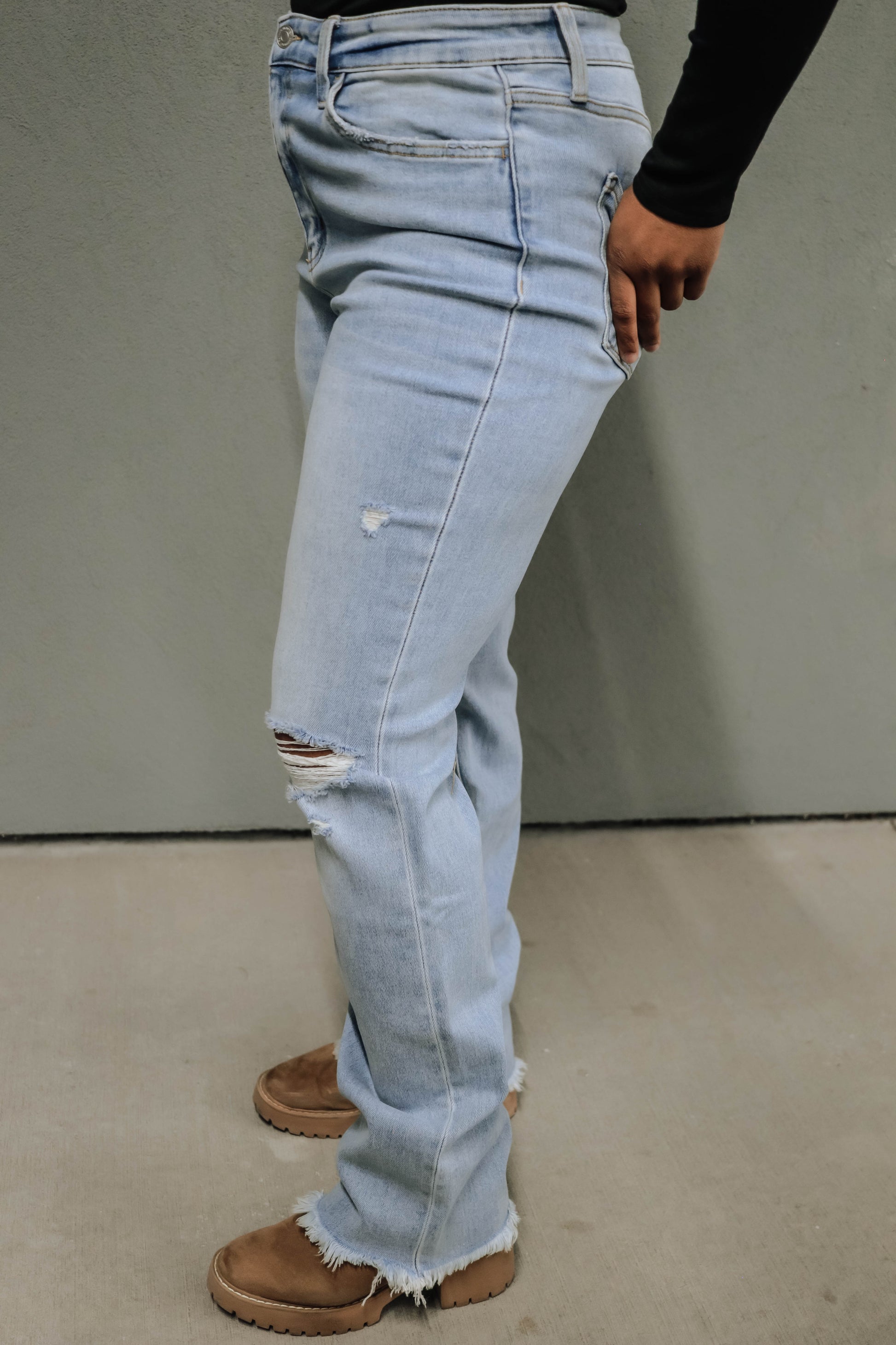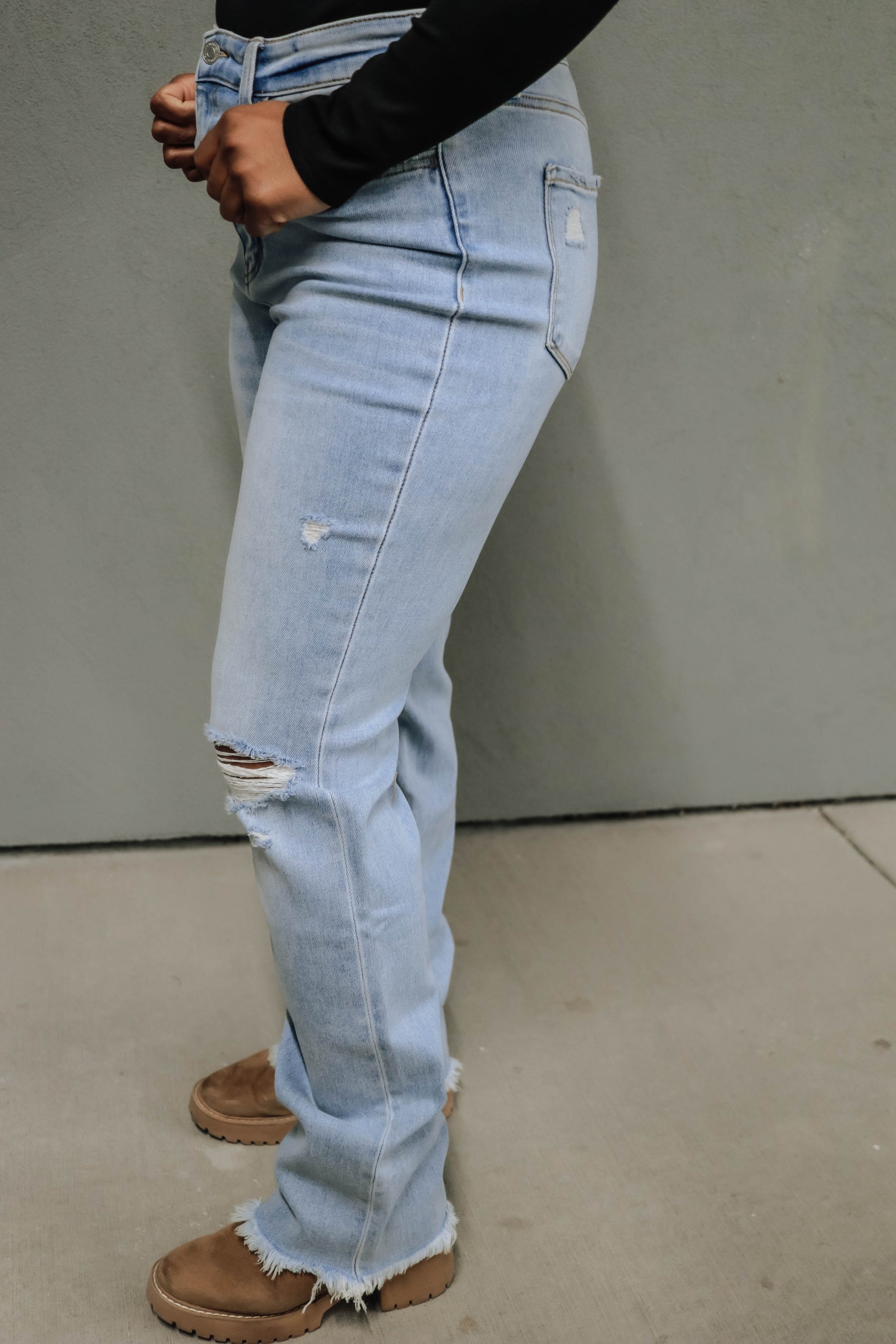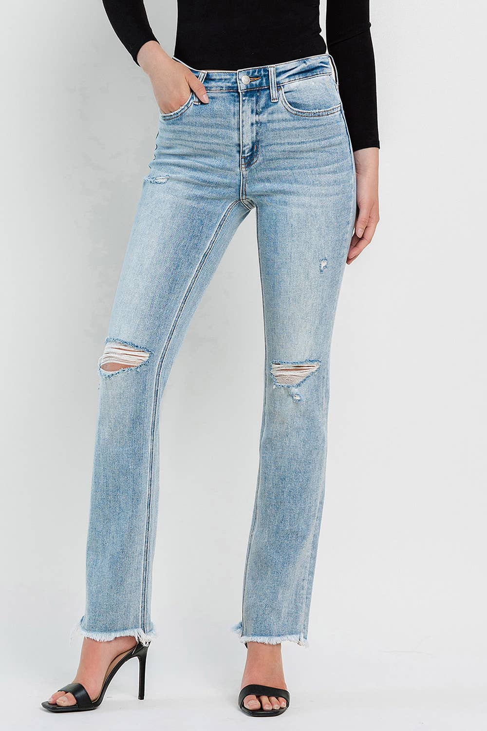 Upgrade your denim collection with our High-Rise Slim Straight Jeans! Made from comfort stretch denim, these jeans feature a flattering high-rise fit, distressed details, and a raw hem for a trendy edge. Perfectly paired with a body suit for a sleek and versatile everyday look that can be transformed with layers!