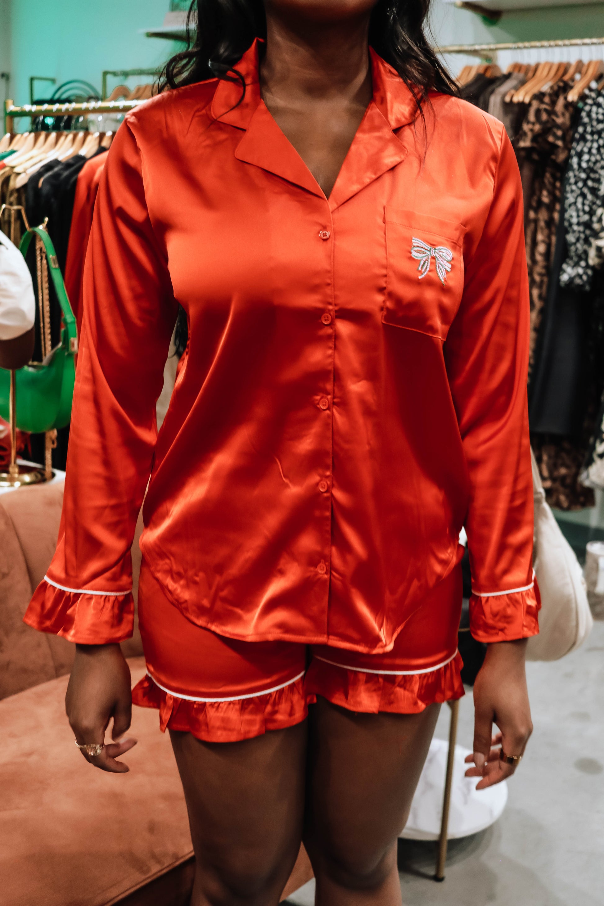 Cozy up in style with this two-piece satin PJ set, beautifully finished with multi-color bow embroidery for the perfect festive touch. The soft, silky fabric gives you that luxurious holiday feel, making it ideal for lounging, gift-giving, or matching with your girls for holiday photos. Comfortable, cute, and full of seasonal charm this set is made to elevate your cozy moments all season long.