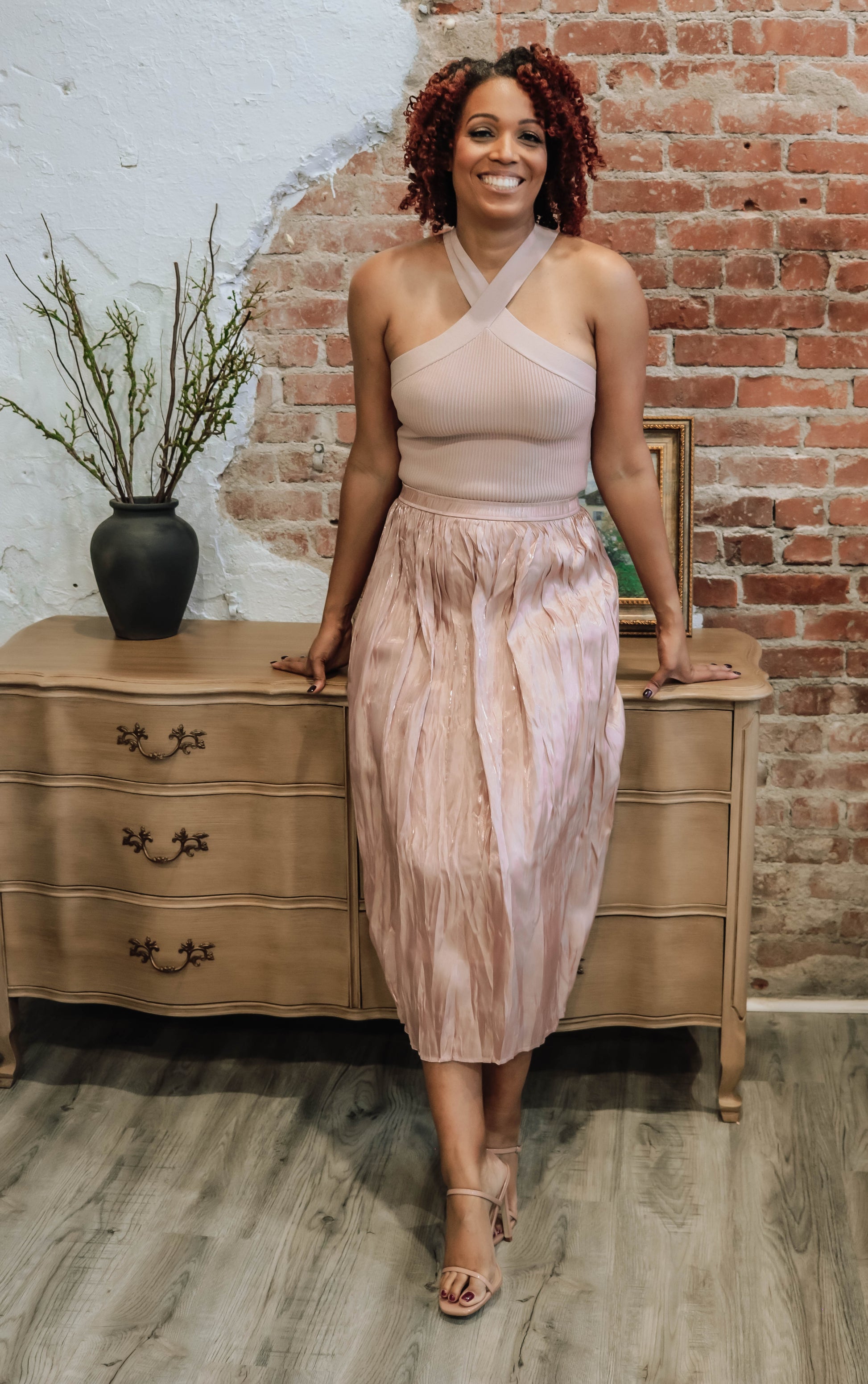 Meet your new favorite top! Our Liya's Halter Top is designed to hug your curves with a sleek, flattering fit, its twisted halter neckline brings a touch of edgy elegance. The soft blush tone makes it perfect for effortless chic with jeans or a standout pairing with flowy skirts like our Rose Midi. Don’t miss this wardrobe must-have!