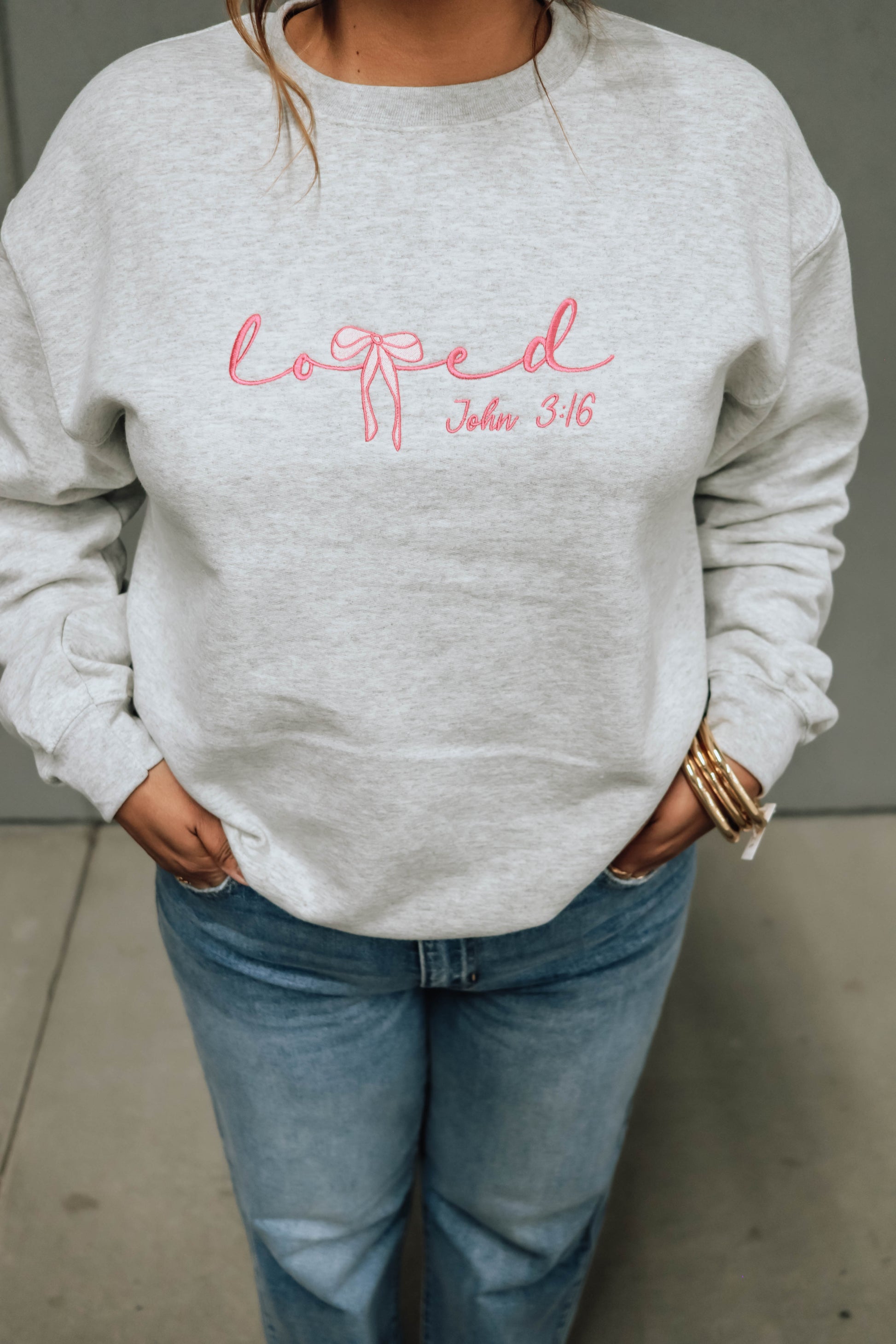 This beautiful sweatshirt combines comfort with meaningful style, featuring an embroidered LOVED JOHN 3:16 design that makes a powerful statement. It's the perfect layering piece for any season. Versatile enough to dress up or down, this sweatshirt delivers warmth without compromising on style. A wardrobe essential that speaks to your values while keeping you cozy.