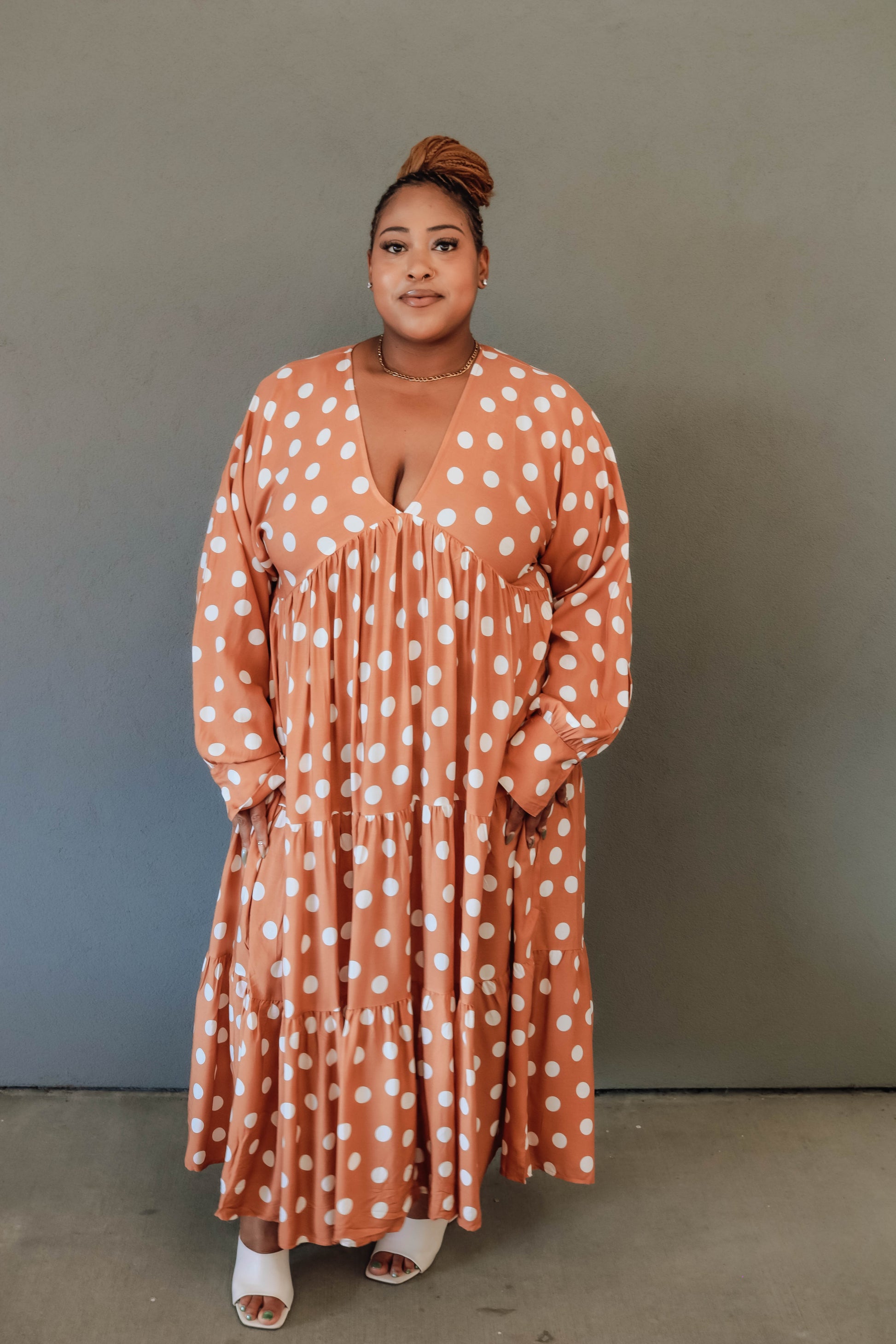 The Mable Midi Dress offers a tiered polka dot design with a flattering v-neckline, elegant long balloon sleeves with buttoned cuffs, and flowing tiers that allow for graceful movement. Perfect for the season and a fun addition to your closet. Snag your now.