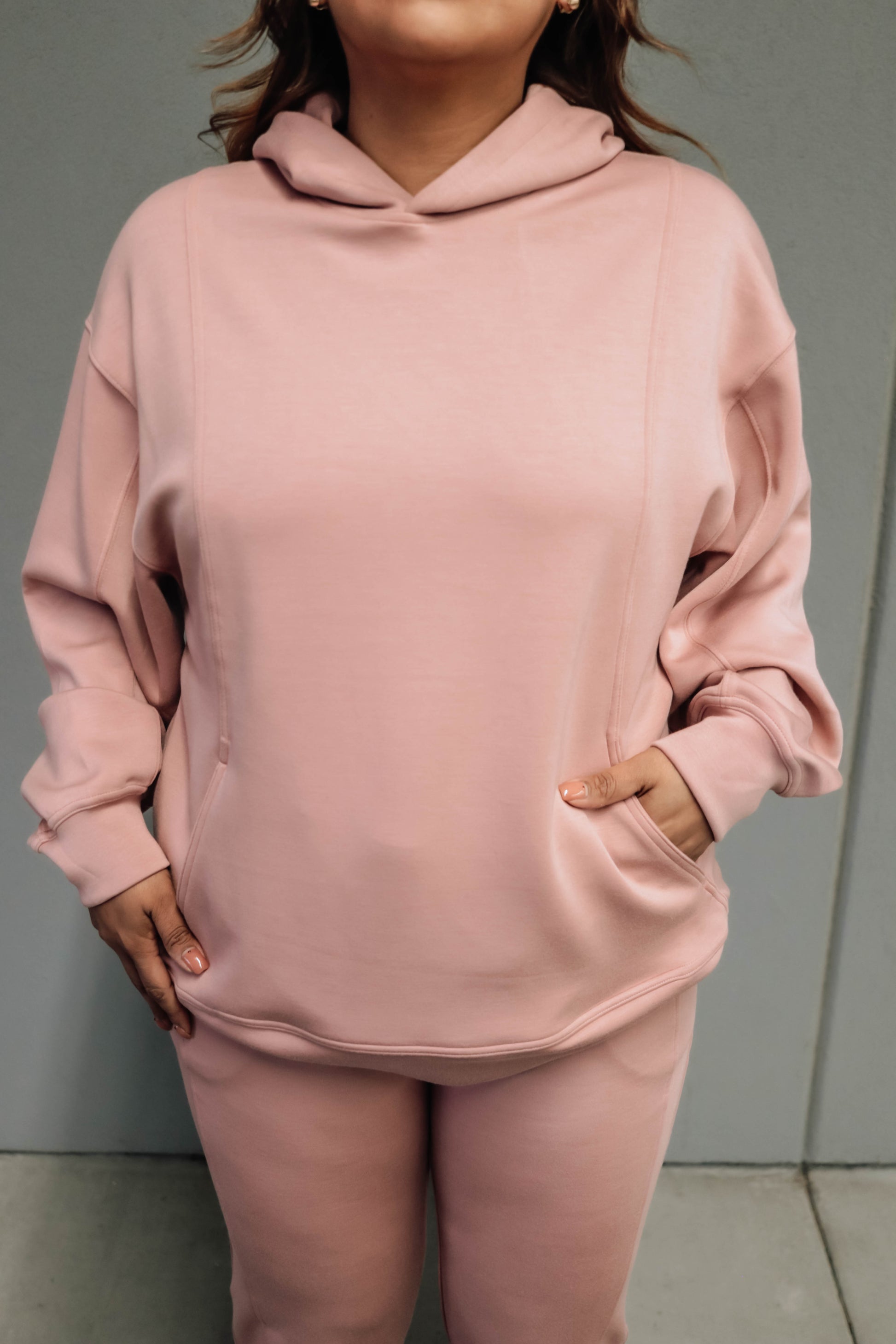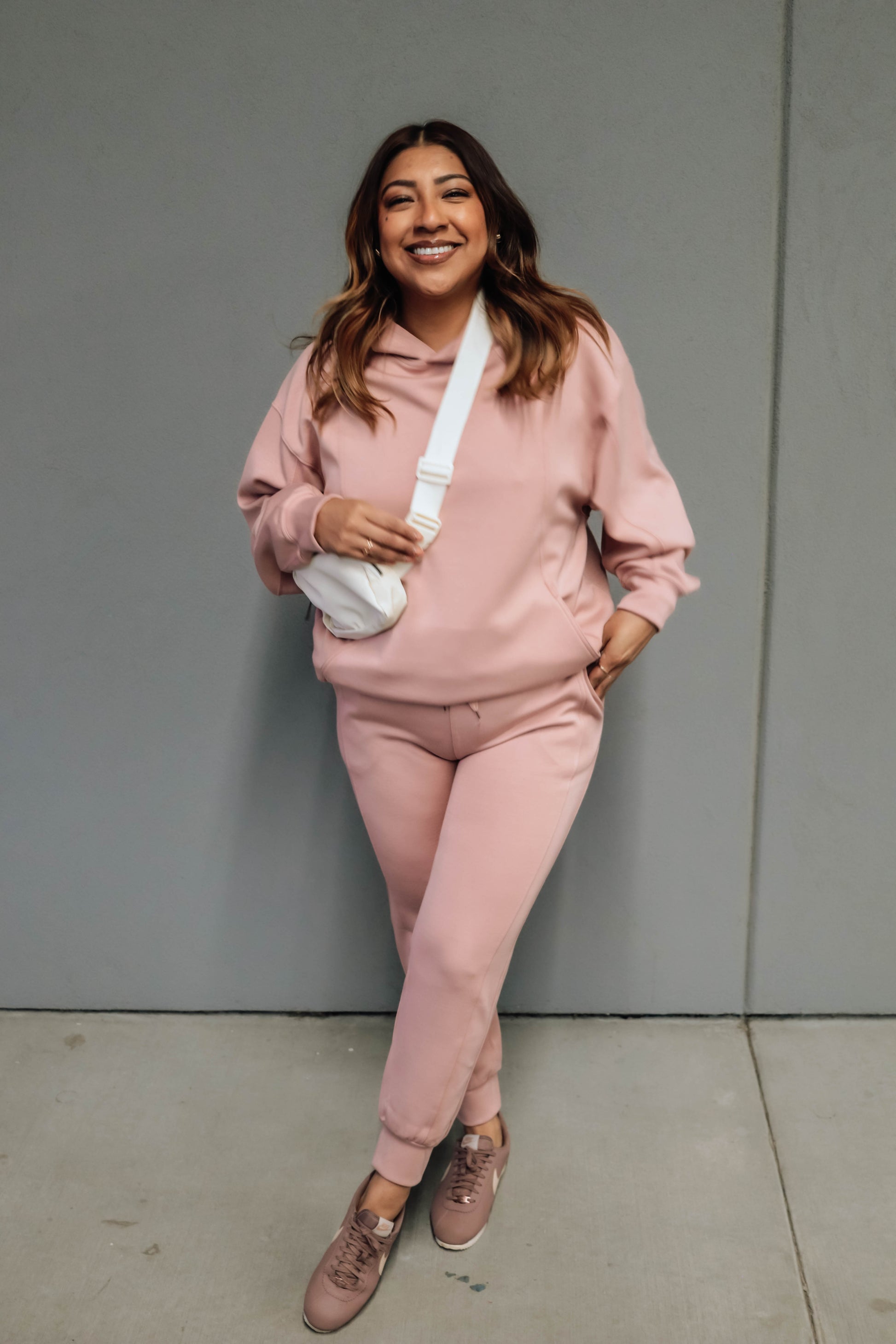 Your new favorite set has landed. Our Naomi Ultra Comfy Set is where style meets ultimate comfort. This sporty-chic set features a luxuriously soft scuba hoodie paired with matching joggers in a beautiful blush tone. The signature scuba neckline adds a touch of sophistication while the plush fabric invites you to stay comfortable all day long. Perfect for everything from casual outings to cozy nights in, this set delivers in every way.