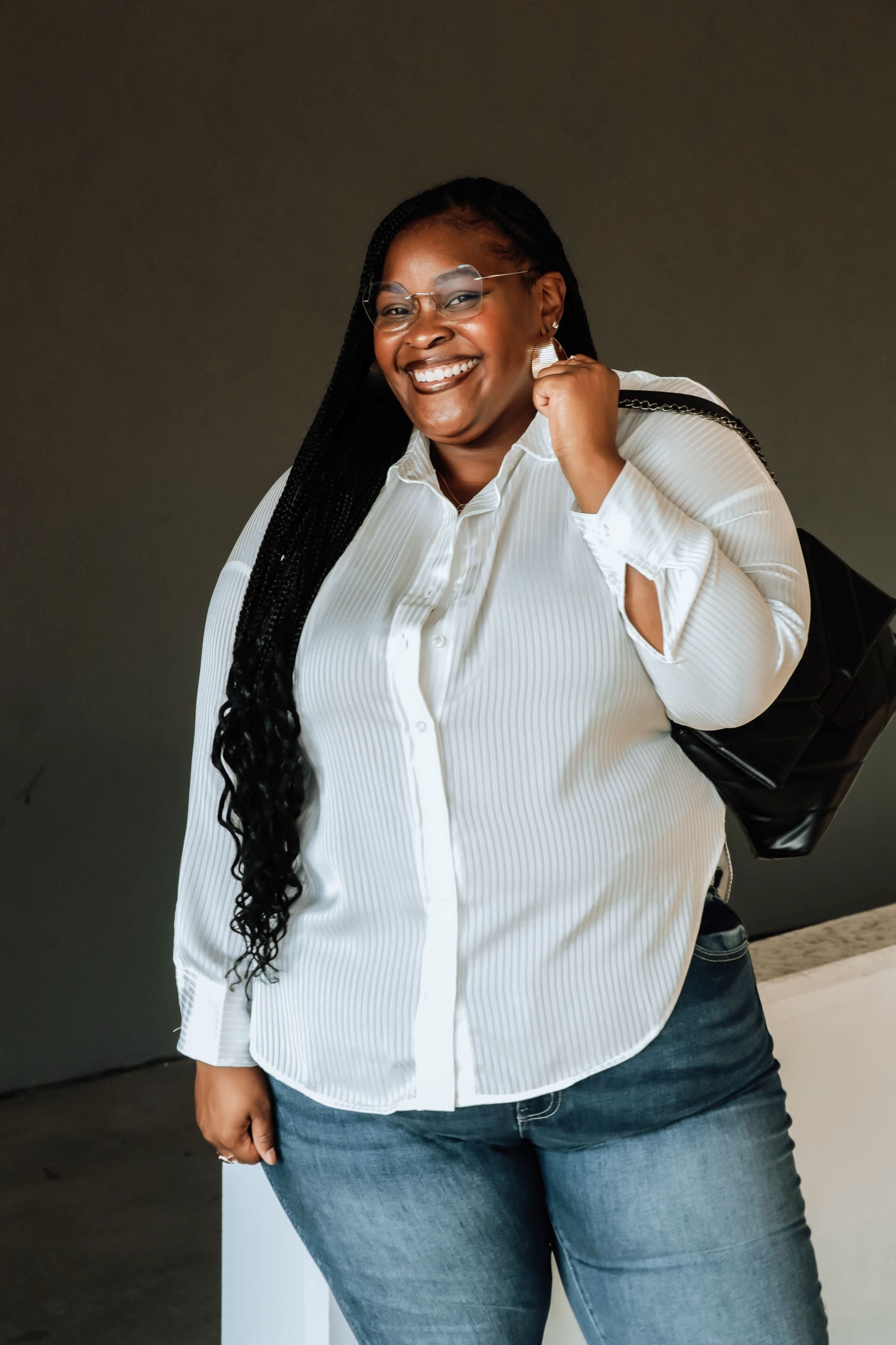 Elevate your style with our Top Notch Button Down Blouse Curvy in white. This stunning top features a striped satin texture, collared neckline, and button cuff details. Perfect for any occasion, it's made with 100% polyester for a comfortable and chic look. Dress up or down with ease!