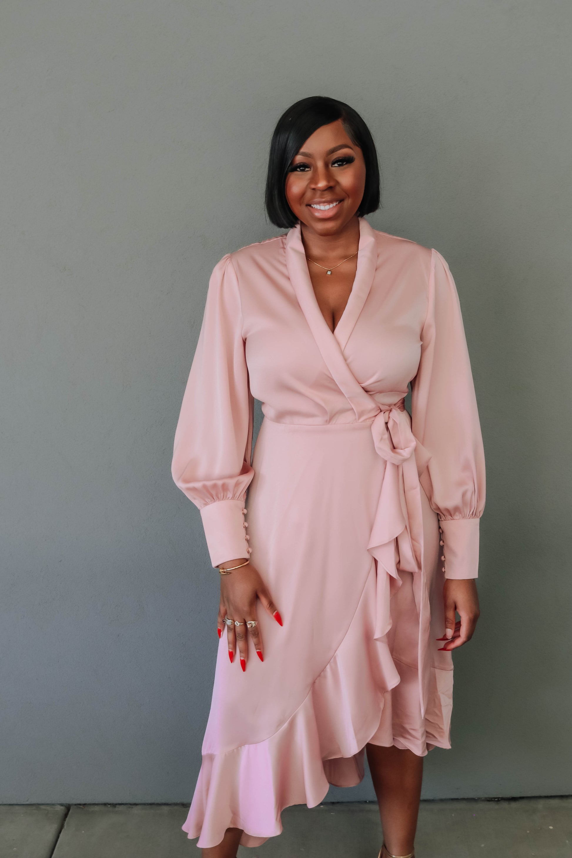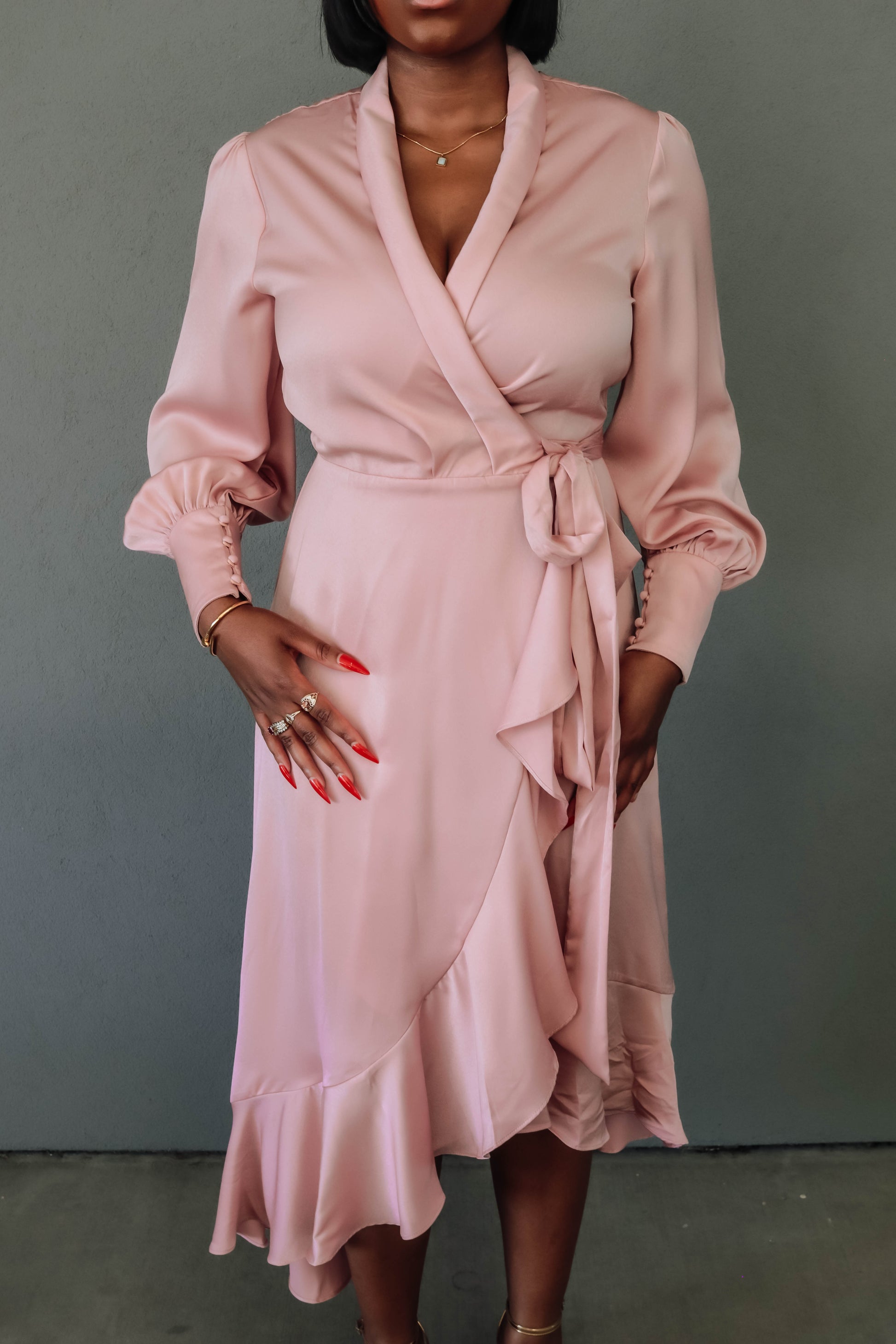 The Aurora Dress is a satin wrap midi with balloon sleeves, a ruffled hem, and tie closures—flowy, flattering, and feminine. Pair it with heels and dainty jewelry for weddings or date nights, or dress it down with sandals and a crossbody for a soft daytime look.