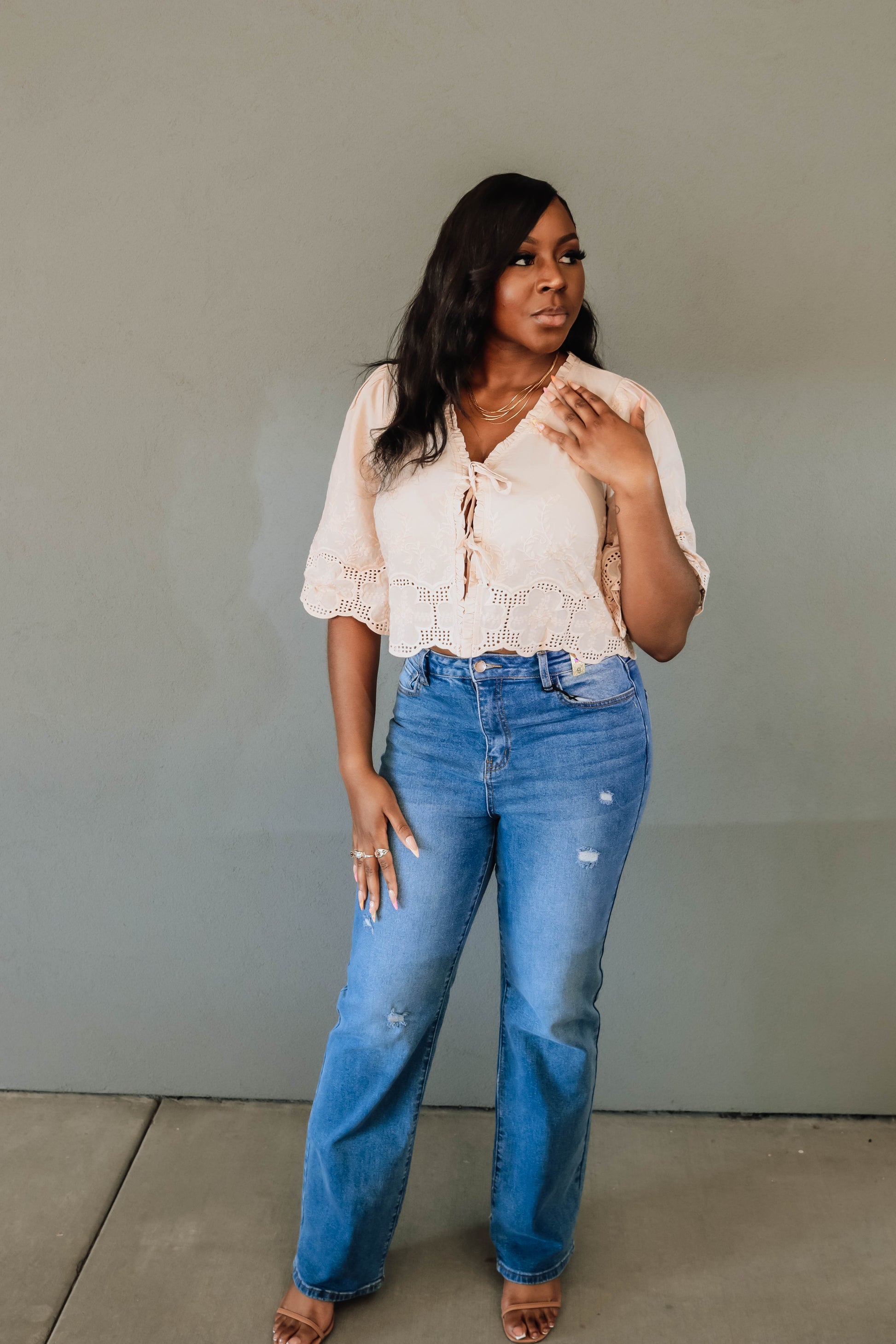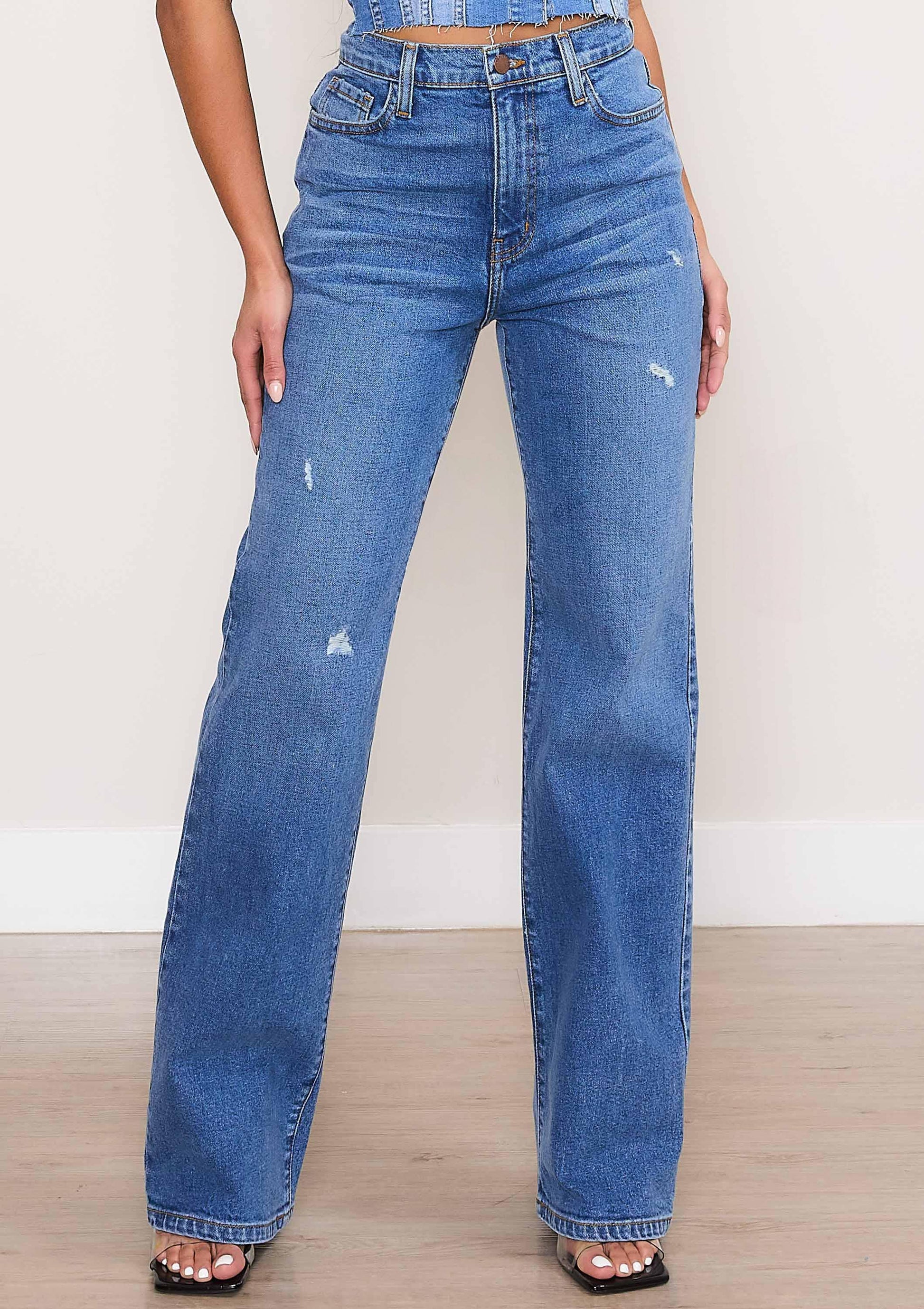 Our Skyline Strides Denim are a high-rise, wide-leg jean that come with delicate distressing, timeless 5-pocket details, and a zip-fly closure. Comfortable and versatile, they’re destined to be your everyday denim crush.