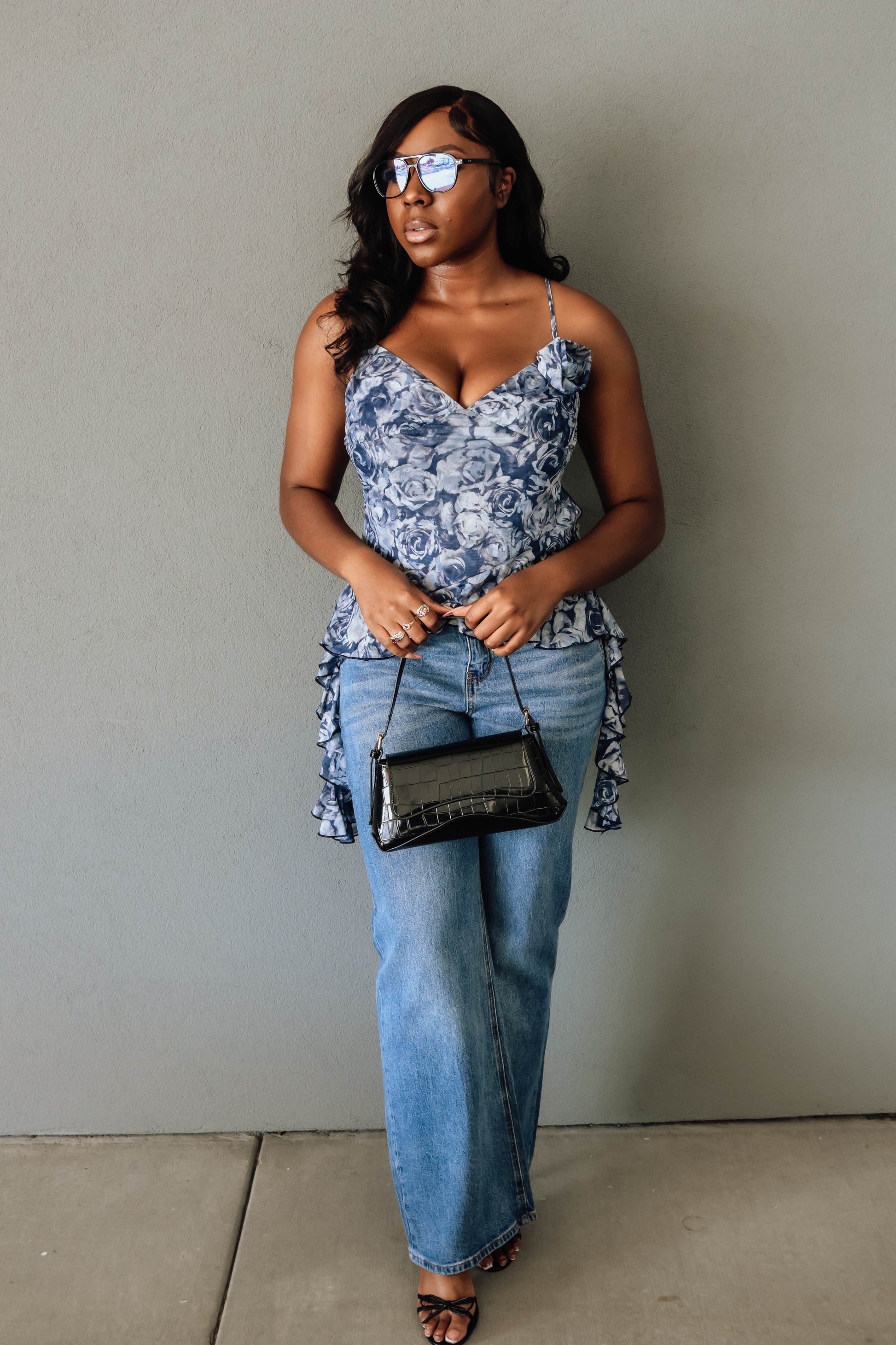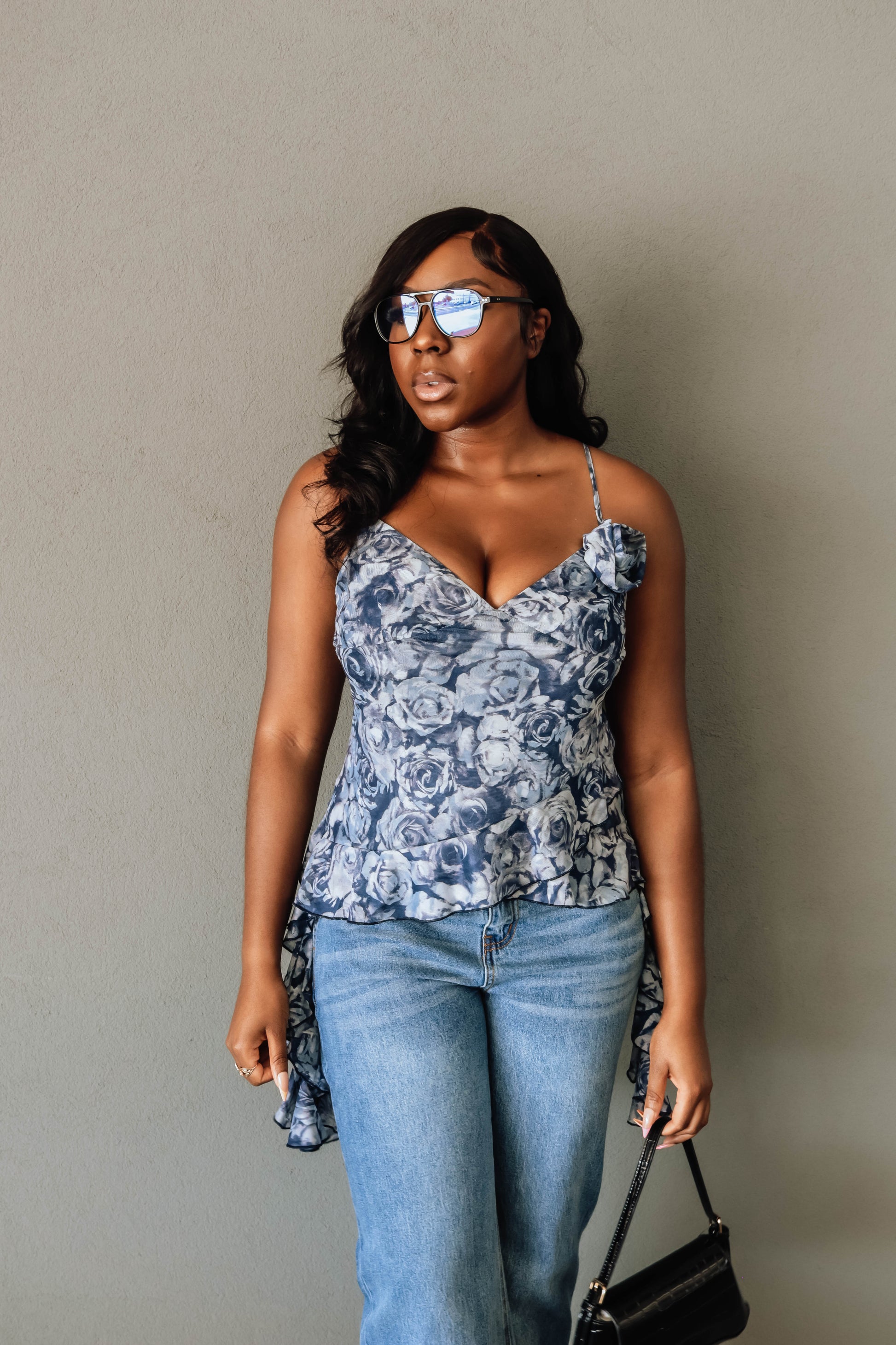 The Vintage Bloom Top features a charming floral design with a unique merrow hem and delicate flower detail. This piece blends vintage charm with modern style, perfect for adding a touch of elegance to your everyday look.