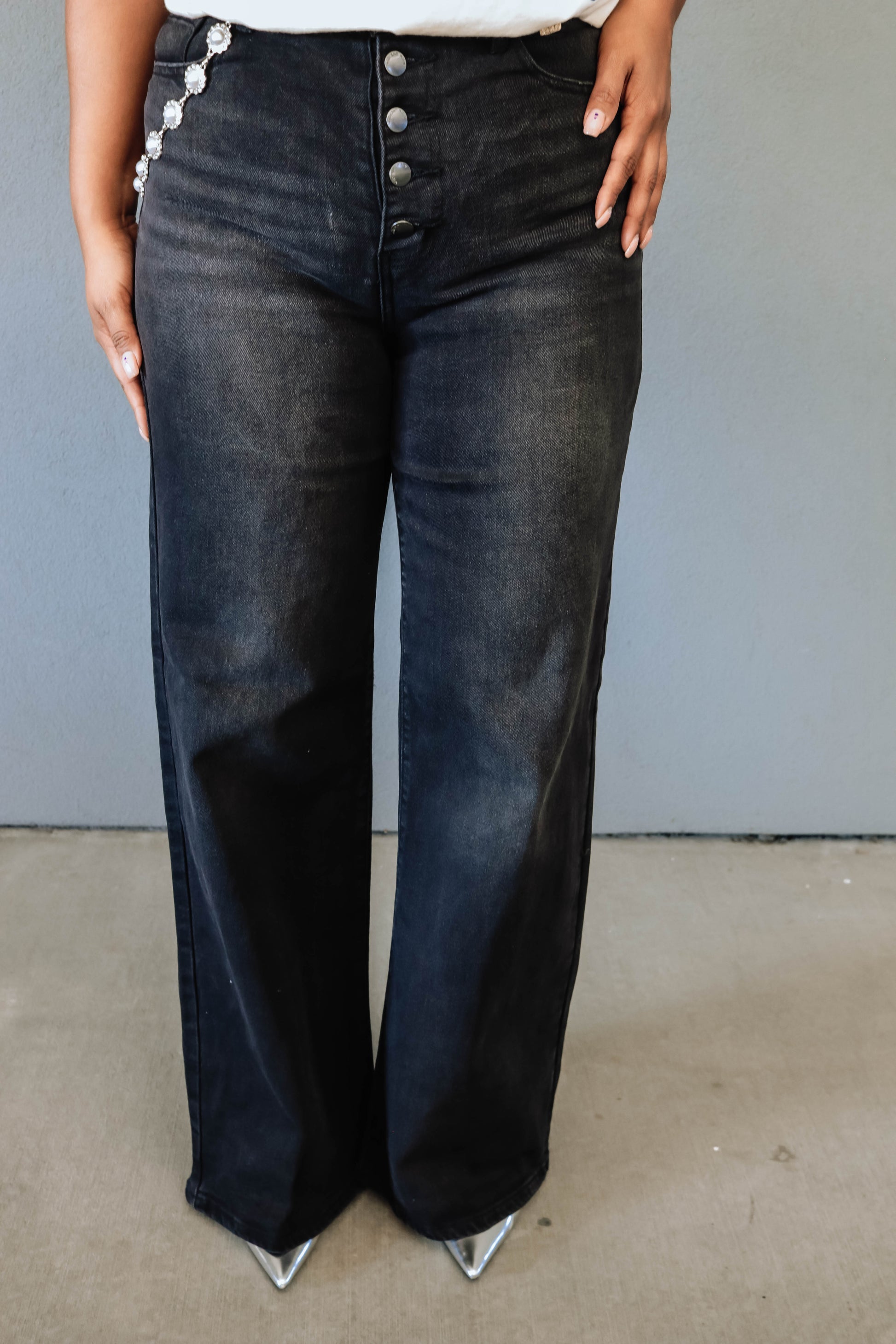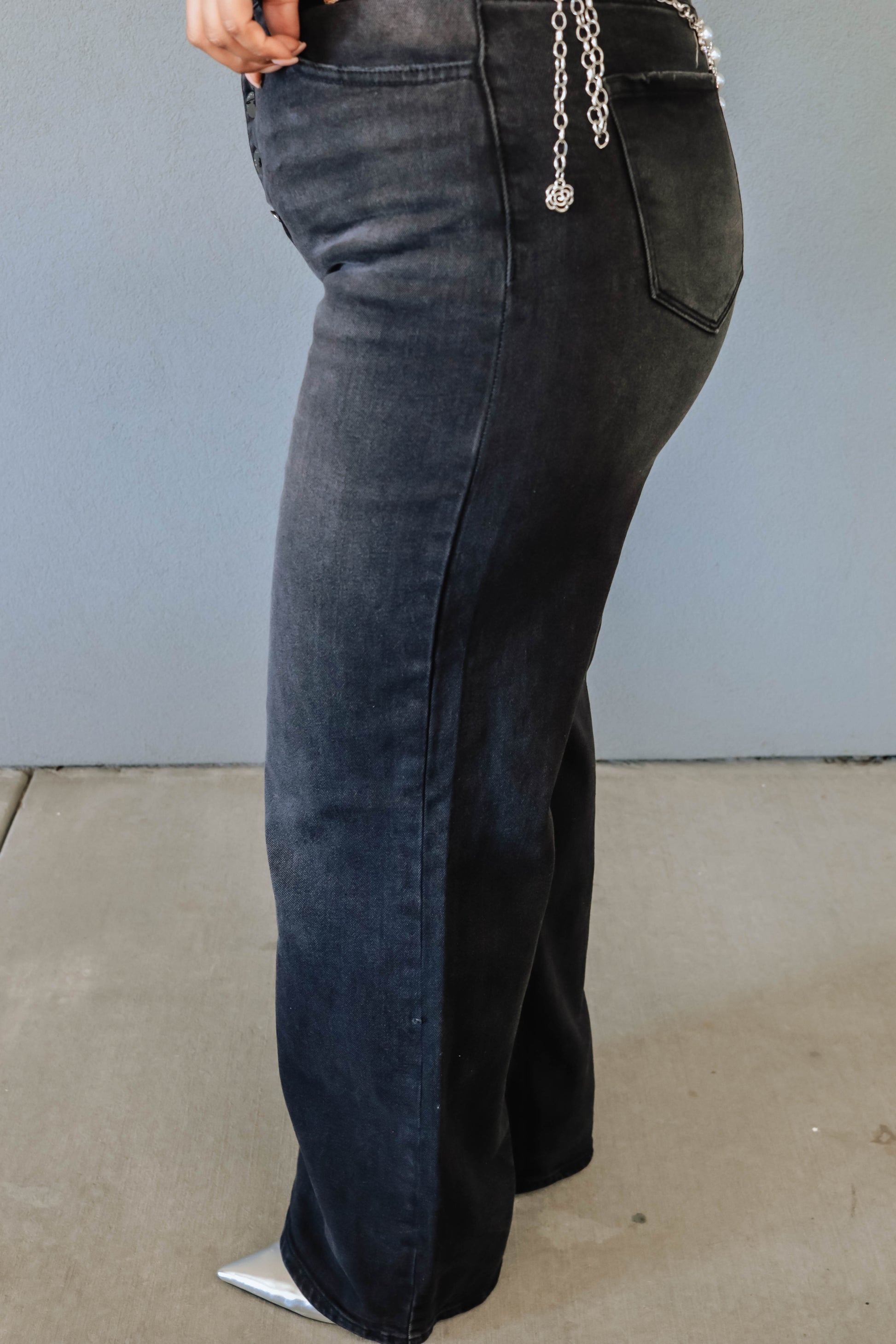 Our everyday wide-leg jeans come with a timeless 5-pocket design and a five-button closure. Whether you're heading to work or dressing up for a night out, these chic black jeans have you covered. Stylishly relaxed and endlessly versatile, they’re a winning choice for any wardrobe.