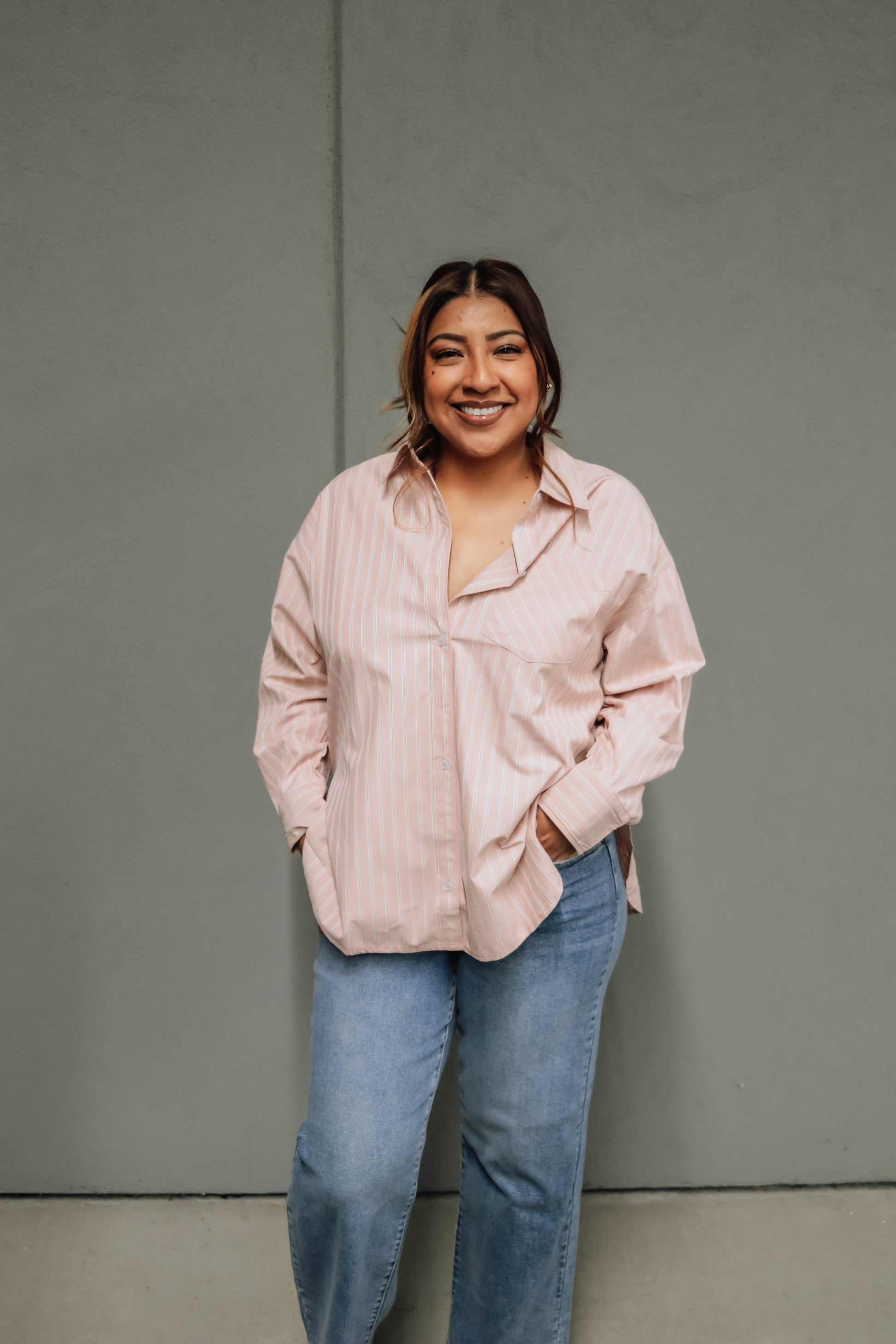 Elevate your everyday wardrobe with the Zari Oversized Button-Down Shirt in Mauve. This striped classic combines refined style with modern comfort. Featuring a structured collared neckline, a seamless button-down and a functional front pocket. The generous oversized fit provides the freedom to move and layer effortlessly. This versatile piece transitions seamlessly from office to weekend, making it an investment piece you'll reach for again and again.